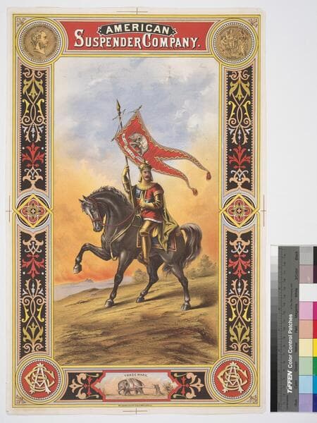 Image of a female lion tamer performing with a lion; the lion rises on its hind legs as the woman pulls on suspender straps at the animal's mouth; two images of medallions with German text indicating an award of merit at the "Weltausstellung 1873 Wein" (1873 World Exposition in Vienna) with looped suspenders at top center; American Suspender Company monogram "ASC" at bottom center.