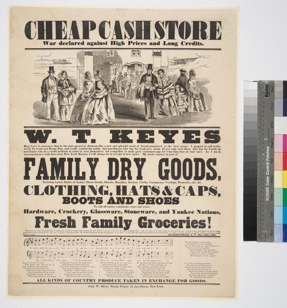 Cheap cash store war declared against high prices and long credits. W.T. Keyes