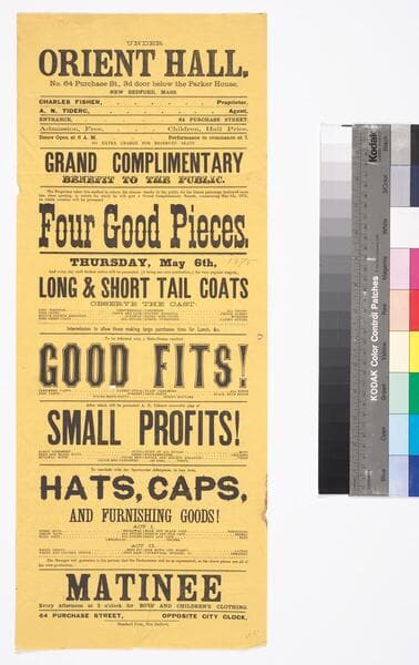 Under Orient Hall, No. 64 Purchase St., 3d door below the Parker House, New Bedford, Mass. Charles Fisher, Proprietor. A.N. Tiderc, Agent