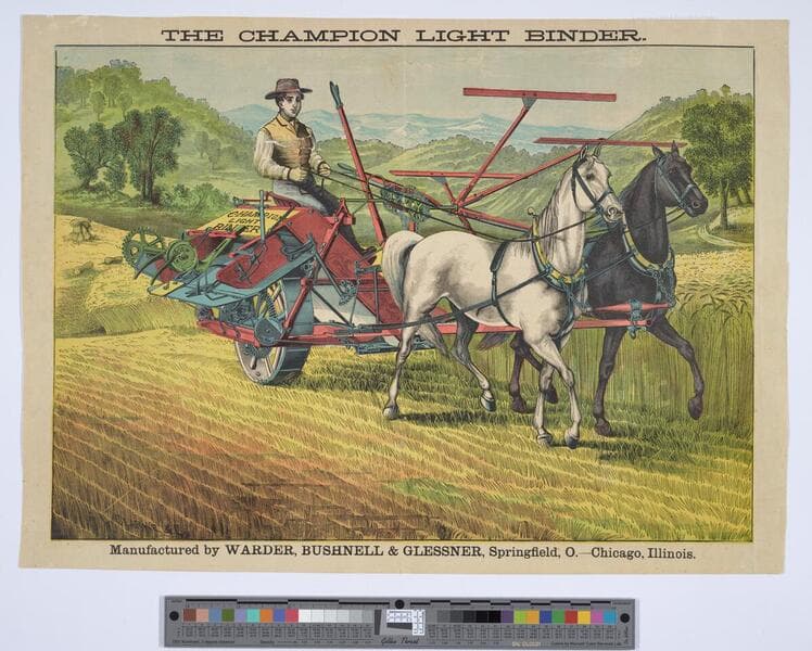 Image of a six-fold advertisement with cover for Warder, Bushnell & Glessner Company's Champion mowers and binders; cover image of a Christopher Columbus seated reclining at a table with map in hand under the skyline of Chicago, Illinois, and a globe; views of the Warder, Bushnell & Glessner Company factory buildings on back cover; images of mowers and binders in use by farmers in fields and diagrams of machinery components interspersed with advertisement text; map of Chicago, Illinois, along Lake Michigan on verso showing proximity and various routes from the "World's Fair Grounds" to the "Office of the Warder, Bushnell and Glessner Co." along with numerical key to buildings, hotels, theaters, and clubs in the area.