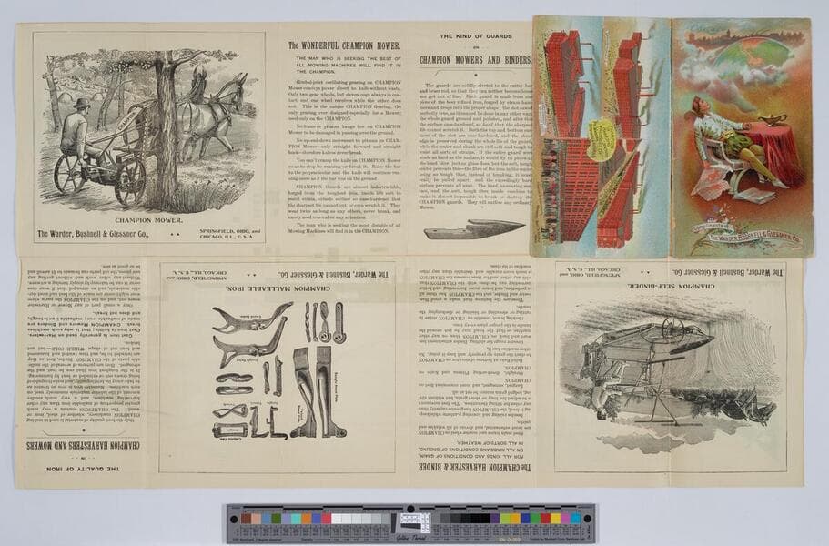 Image of a farmer working with a Champion light binder machine in a field with a team of horses in an advertisement for Warder, Bushnell & Glessner manufacturers of Springfield, Ohio, and Chicago, Illinois; hilly landscape in background.
