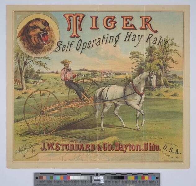 Image of a three-fold advertisement for Tiger agricultural rakes manufactured by Stoddard Manufacturing Company of Dayton, Ohio, and sold by George Tyler & Company of Boston, Massachusetts; advertising text interspersed with images of rakes and the tigers representing the company, including a tiger hitched to a hay rake with an eagle on the seat pulling on the reins.