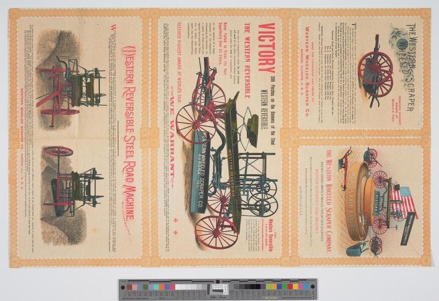 Image of a four-fold advertisement for agricultural machinery manufactured by the Grand Detour Plow Company of Dixon, Illinois; harrows and draw bars with advertising text captions on recto and verso.