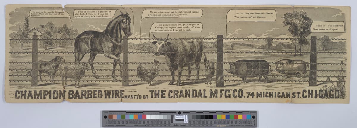 Image of livestock and other farm animals, including a dog, sheep, horse, chickens, a cow, and pigs, discussing the successful use of Champion Barbed Wire in terms of visibility and effectiveness in a five-fold advertisement for The Hazard Manufacturing Company of New York, New York; dialogue balloon captions above each animal; advertisement text on verso.