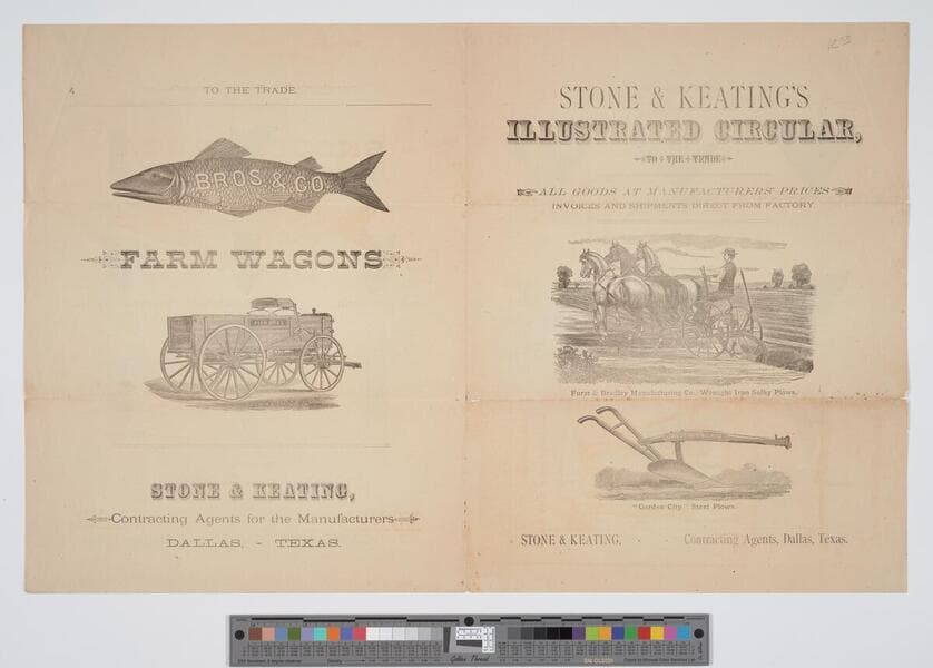 Image of a four-fold advertisement for plows made by Bucher, Gibbs & Company of Canton, Ohio; text with descriptions, advertising, and warranty information with images of various plows on inner panels.