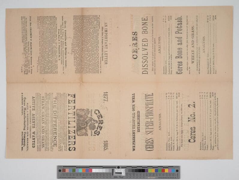 Image of a five-fold advertisement for fertilizer manufactured by Pacific Guano Company of Boston, Massachusetts, and sold by H. A. Blake of Sutton, Vermont; advertising text and testimonials throughout; images of a fish, a mammoth skeleton, and an aquatic bird eating a fish while standing atop a bag of "Soluble Pacific Guano" on cover panels.