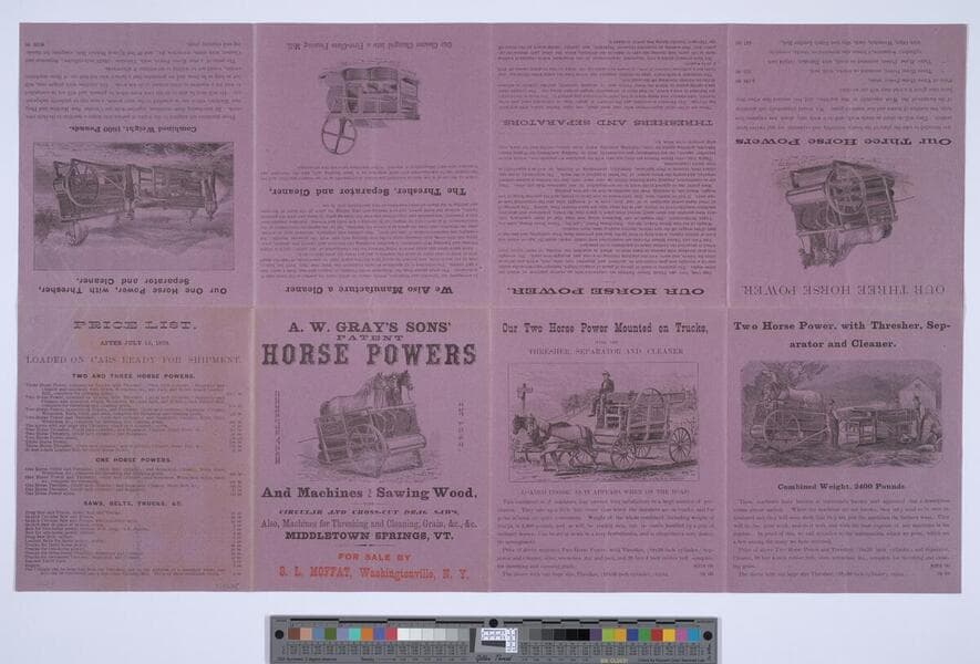 Image of a group of farmers working a threshing machine in a field in an advertisement for A.W. Gray's Sons of Middletown Springs, Vermont; two horses on a treadmill supply power for the machine while the three men load grain and straw on and off the thresher; partially harvested fields and landscape in background.