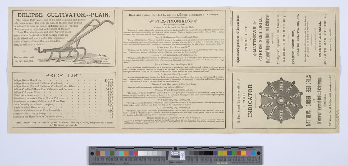 Image of a five-fold advertisement for agricultural equipment manufactured by J.M. Childs & Co. of Utica, New York; advertising text and price lists interspersed with images of plows, mowers, rakes, and other products.