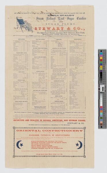 - Image of a price list for Stewart & Company confectioners of New York, New York; lists of candies including stick, drops, sugar plums, gum drops, cough candy, and chocolate varieties with American Flag at top left; additional advertising for Stewart & Company's importing of Cuban, American, and German cigars; fig and grape-based confections from Oriental Confectionery advertised at bottom center flanked by star and crescent moon silhouettes.