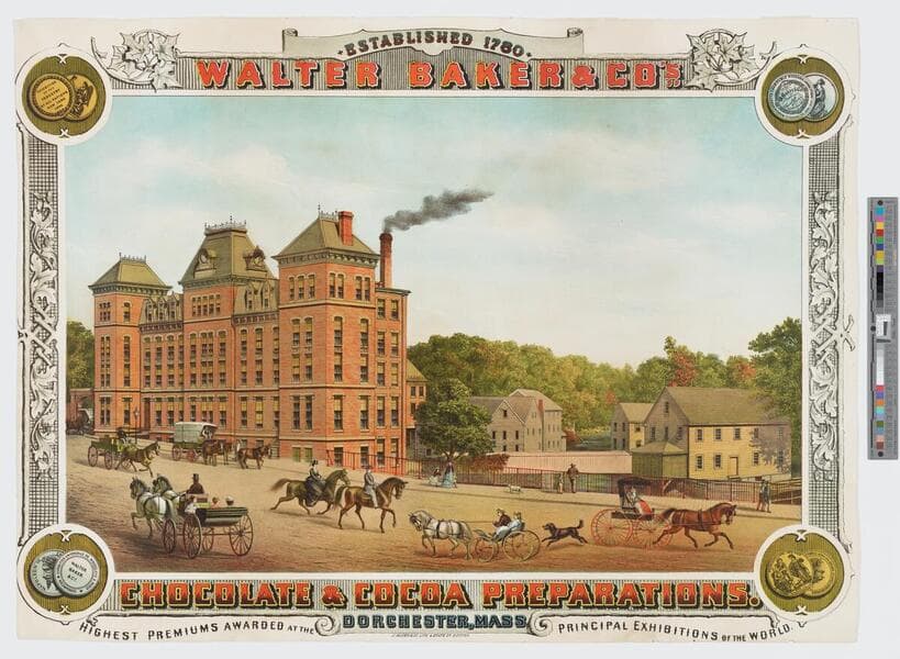 Image of an advertisement for cocoa and chocolate manufacturers Walter Baker & Company of Boston, Massachusetts; cacao plantation laborer in native dress at left; frontier hunter and dog with covered wagon at right; bald eagle with Union shield, "Established 1780" banner, and American flags at top center; lower vignettes show the W. Baker & Co. cocoa mill building in Dorchester, Massachusetts, shipments being transported by train, and boxes being loaded from ship docks onto horse-drawn carts.