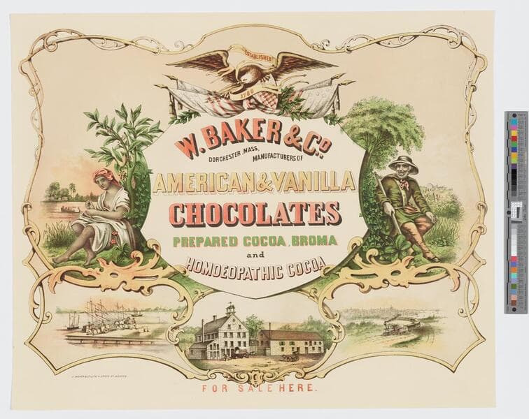 Image of an advertisement for cocoa and chocolate manufacturers Walter Baker & Company of Boston, Massachusetts; cacao plantation laborer in native dress at left; frontier hunter and dog with covered wagon at right; bald eagle with Union shield, "Established 1780" banner, and American flags at top center; lower vignettes show the W. Baker & Co. cocoa mill building in Dorchester, Massachusetts, shipments being transported by train, and boxes being loaded from ship docks onto horse-drawn carts.