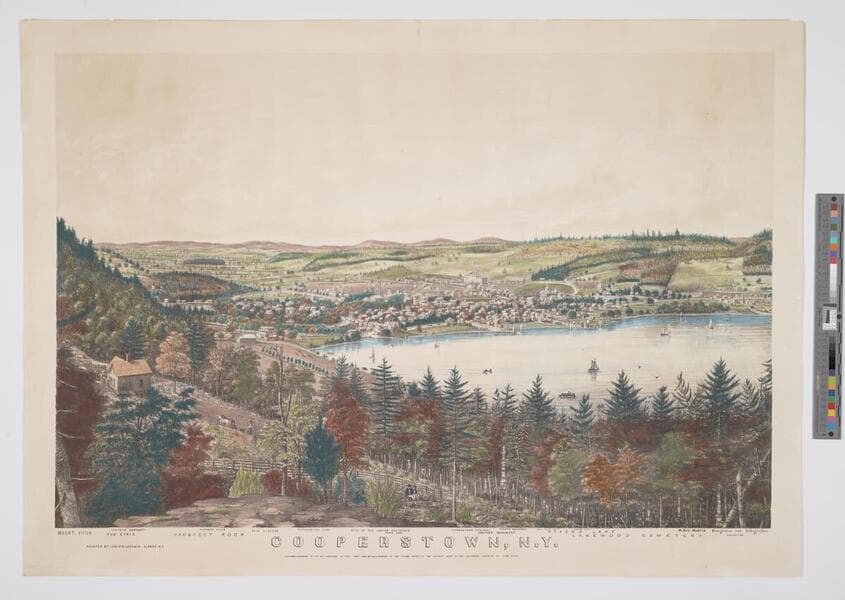 - Image of an elevated landscape view of Cooperstown, New York, from across Otsego Lake; key in bottom margin.