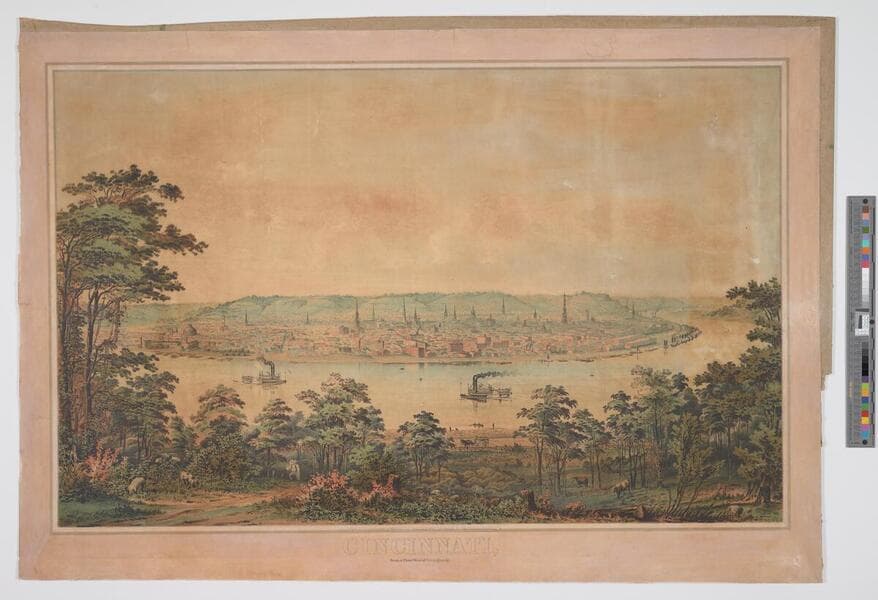 - Image of an elevated landscape view of Cincinnati, Ohio, as viewed from Covington, Kentucky, across the Ohio River; steamboats sail on the river; trees and livestock in foreground.