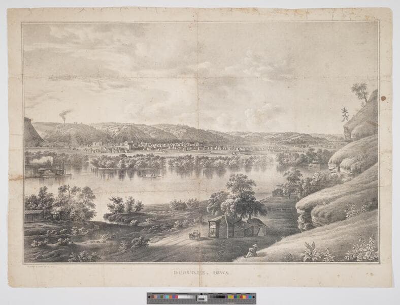 - Image of an elevated landscape view of Dubuque, Iowa, as viewed from across the Mississippi River; steamboats sail on the river; log cabins in foreground.