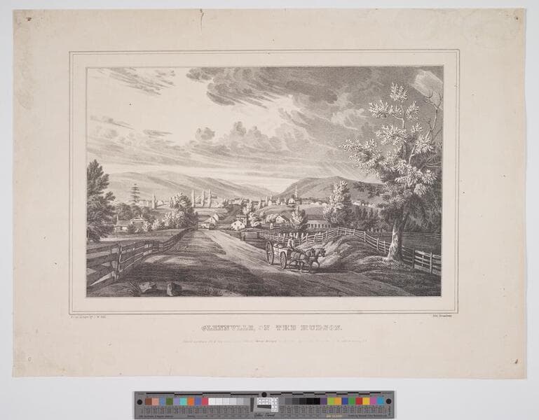- Image of an eye-level view of a fence-lined dirt road leading to the town of Glenville, New York; horse-drawn wagon on road in foreground.