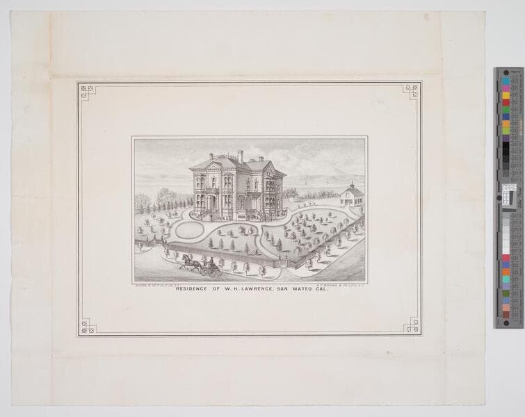 - Image of an elevated view of a two-story home amid landscaped grounds situated on a fenced corner lot; horse-drawn vehicle passing on the road in foreground; smaller structure behind house at far right.
