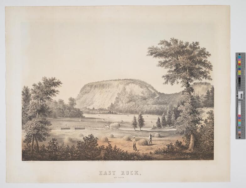 - Image of a landscape view of East Rock mountainous ridge in New Haven, Connecticut; workers haying in foreground at center near a dirt road and bridge; horse-drawn cart full of hay at center.