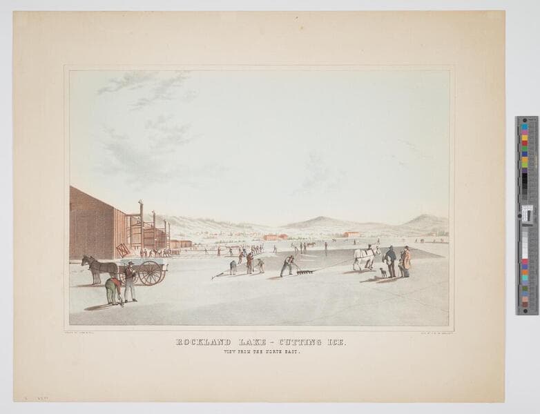 - Image of an eye-level view of ice cutting on Rockland Lake in New York; horses, men, and boys work to cut the ice to load on wagon in foreground; winter landscape and town in background.