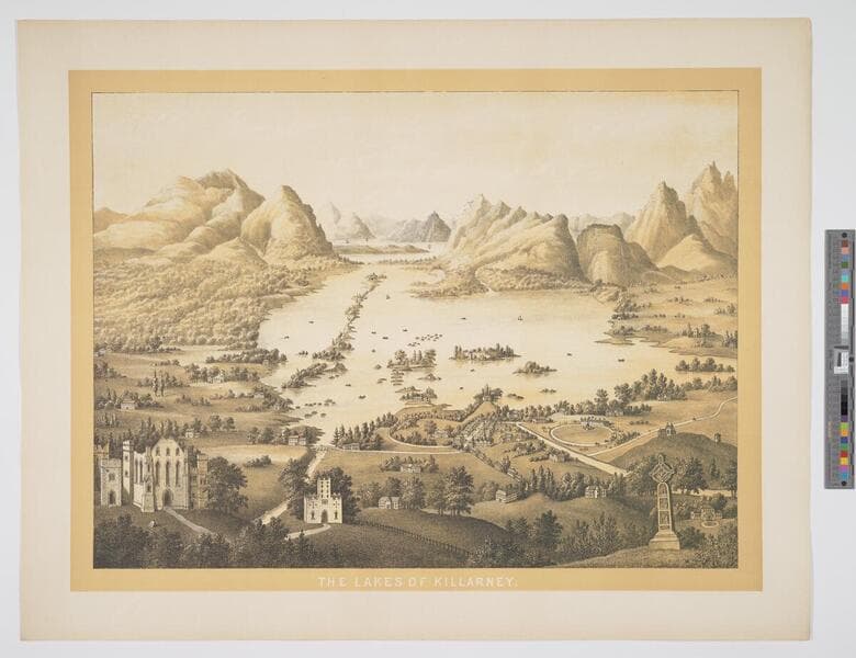 - Image of an elevated view of the Lakes of Killarney, Ireland; town buildings in hills and on shore in foreground; lakes extending into the hills in background.