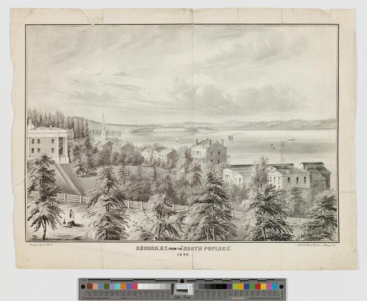 - Image of an elevated view of Aurora, New York, with boats sailing on Lake Cayuga in background; poplar trees in foreground.