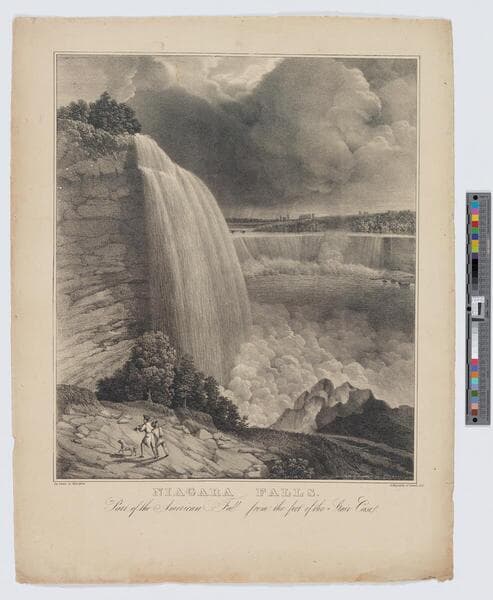 - Image of a landscape view of the American Falls from the foot of the staircase at Niagara Falls; two men with rifles and a dog at bottom left.