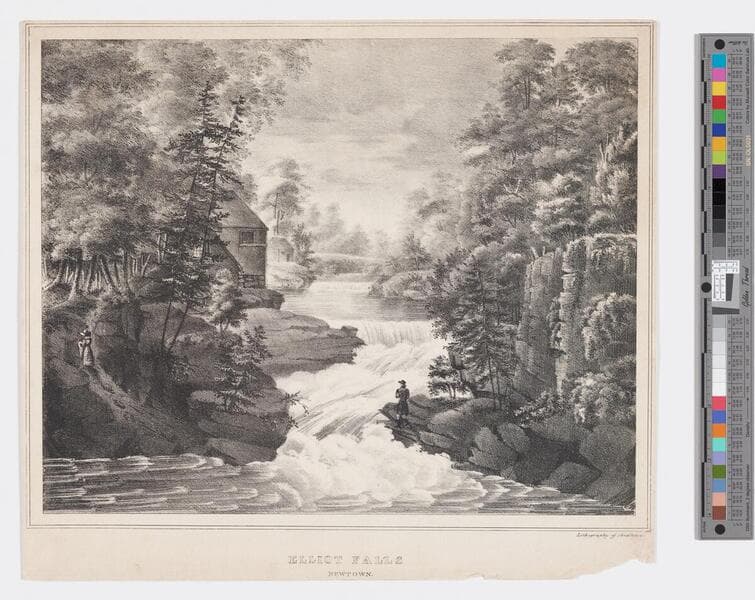 - Image of a landscape view of Elliot Falls waterfall near Newtown; homes visible along left bank; woman walking on path at left; man standing on the bank near the falls at center.
