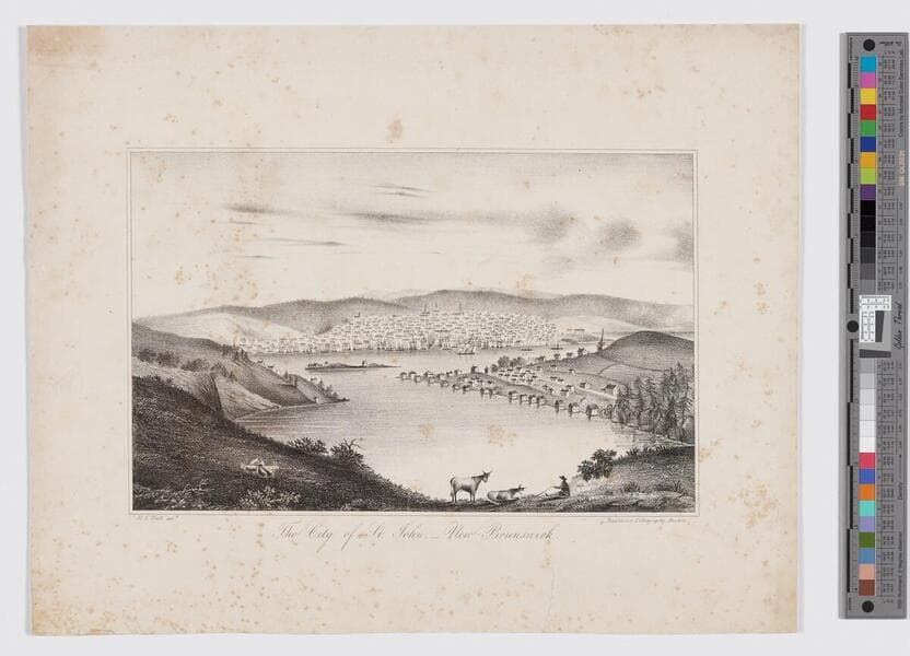 - Image of an elevated landscape view of Saint John, New Brunswick, on the Bay of Fundy at the mouth of the Saint John River; man sitting on coast with livestock in foreground.