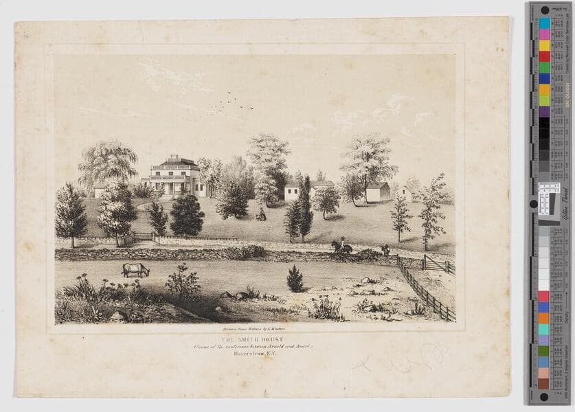 - Image of an eye-level view of the Joshua Hett Smith house and grounds in Haverstraw, New York, scene of the treasonous meeting between General Benedict Arnold and British Major John André during the American Revolutionary War; man on horseback riding along road in front of house; cow in field in foreground at left.