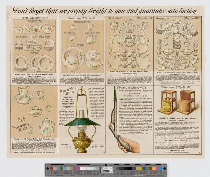 Image of an advertisement for Wrigley's gum featuring promotional products available with purchase of chewing gum, including scales, desks, cash registers, display cases, and other home, office and merchandising items.