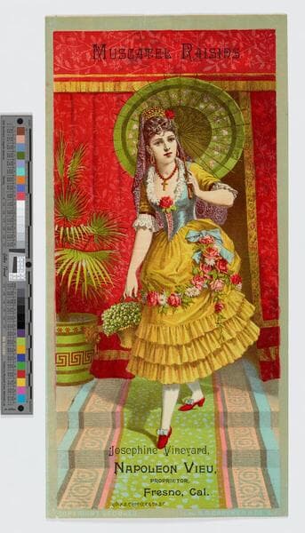 Image of a fruit label for Fresno Raisin & Fruit Packing Company of Fresno, California; woman with a parasol in Spanish ethnic costume with mantilla carrying a basket of grapes.