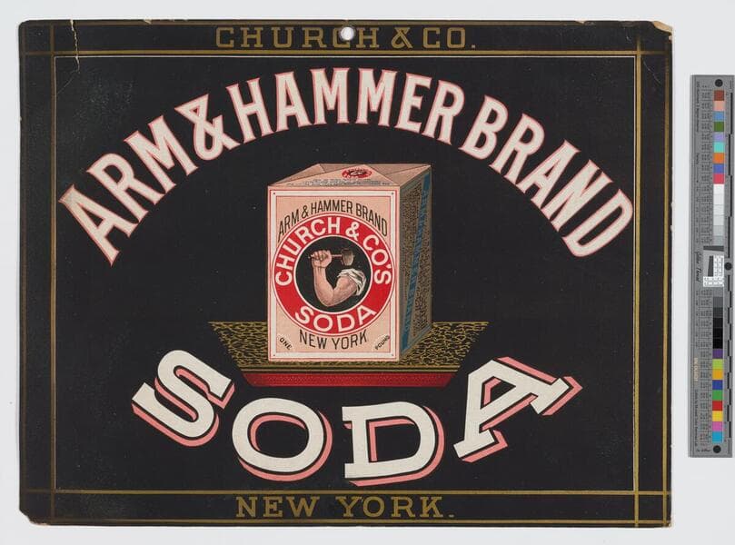 Image of an advertisement for Arm & Hammer brand baking soda by Church & Company of New York, New York; an arm holding a hammer is pictured surrounded by text and a border.