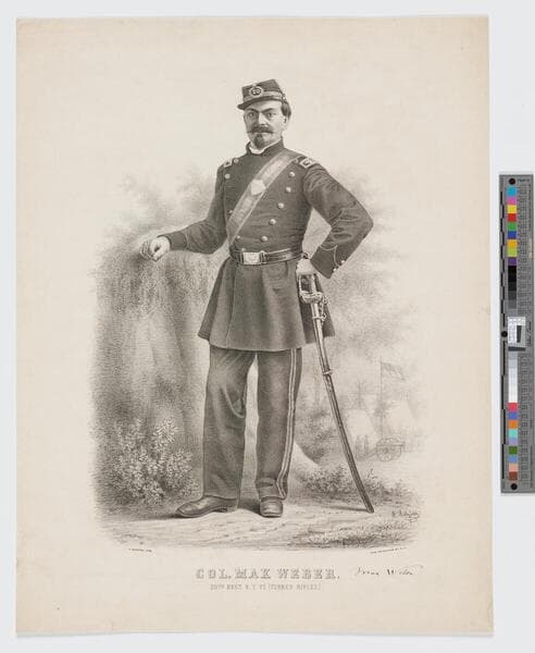 - Image of a full-length portrait of Colonel Max Weber of the 20th New York Volunteer Infantry Regiment ("Turner Rifles"), his body turned slightly to the left with sword in left hand and right forearm resting on a grassy knoll; Weber's signature printed at bottom right margin.