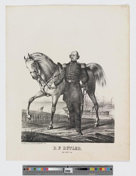 - Image of a full-length portrait of Union Major General Benjamin Franklin Butler standing holding the reins of a horse in full uniform during the American Civil War; ranks of Union soldiers standing at attention and ships along the shore visible in the background.