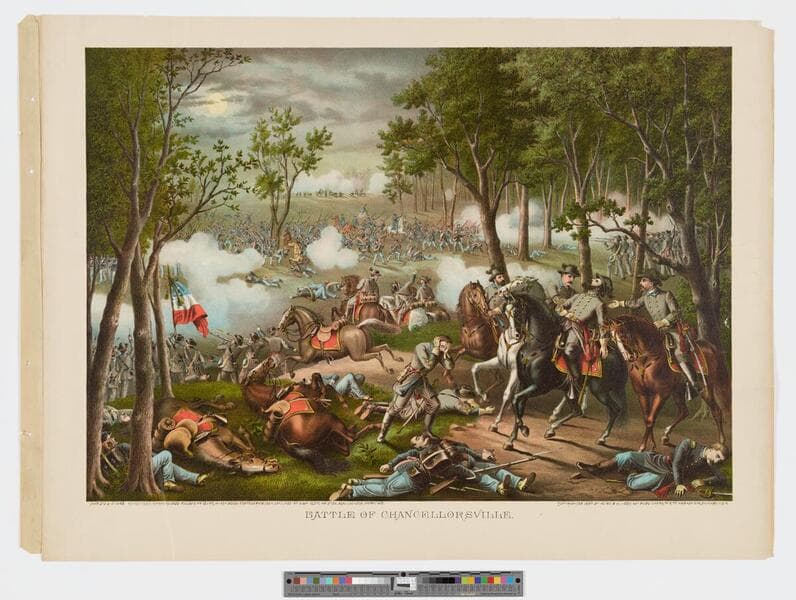 - Image of an eye-level view of the Battle of Chancellorsville, Virginia, during the American Civil War depicting the death of Confederate General Thomas Jonathan "Stonewall" Jackson, as he falls backwards on his horse in the right foreground; wounded and dead Confederate and Union soldiers and horses in the foreground amidst trees; soldiers fighting in a clearing in the distance.