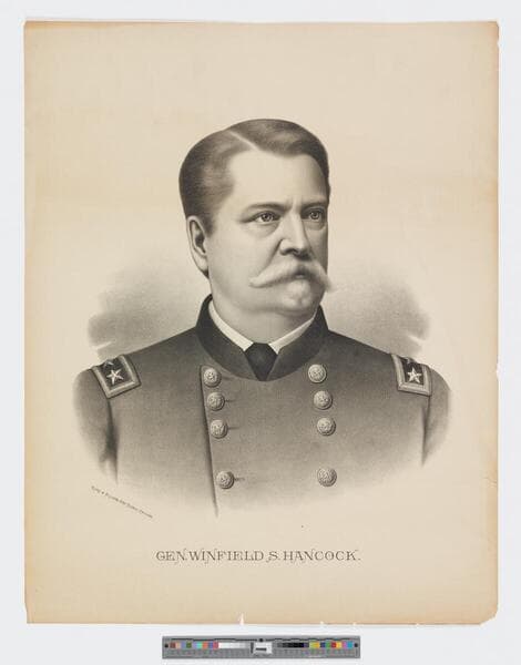 - Image of a bust-length portrait of American Civil War Union General Winfield Scott Hancock in military uniform.