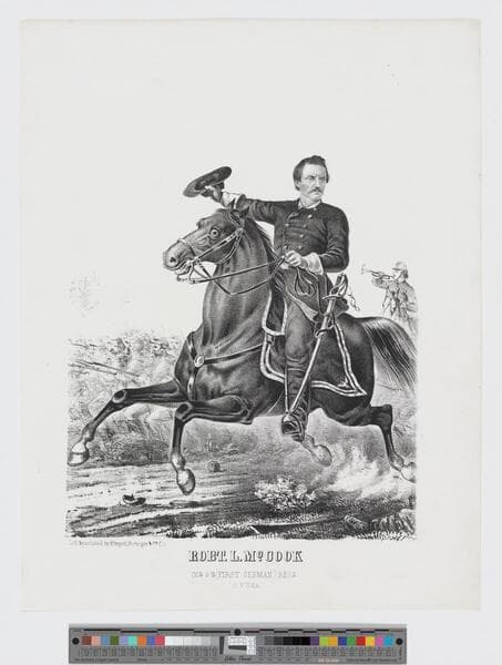 - Image of a full-length portrait of American Civil War Union Colonel Robert Latimer McCook seated on horseback in military uniform with arm outstretched and hat in hand.