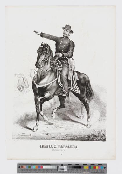 - Image of a full-length portrait of American Civil War Union Major General Lovell Rousseau seated on horseback in military uniform; horses, soldier, and cannon visible in background.