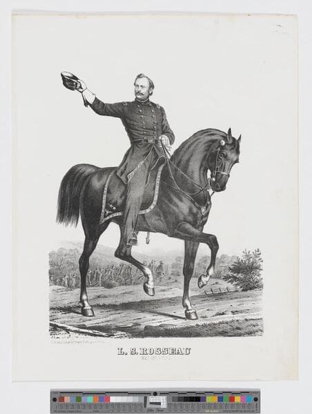 - Image of a full-length portrait of American Civil War Union Major General Lovell Rousseau seated on horseback in military uniform with cap in hand and arm outstretched; soldiers marching through the countryside visible in background.