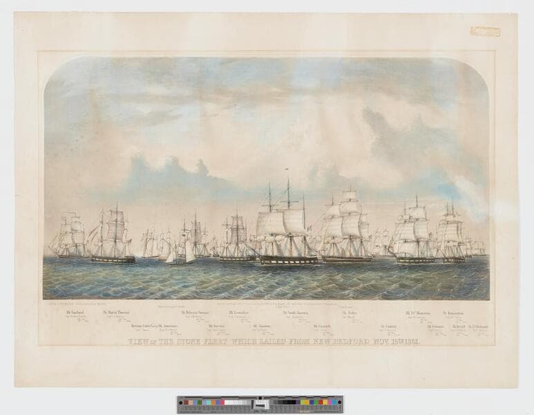 Image of a fleet of ships that made up the Stone Fleet that sailed from New Bedford, Massachusetts, on November 16, 1861 during the American Civil War; names of all pictured vessels along with their captains and tonnage captioned in bottom margin.