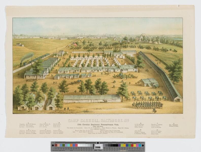 - Image of Camp Carroll in Baltimore, Maryland, during the American Civil War; military tents and buildings, artillery, and a group of soldiers on horseback in foreground with the 13th Cavalry Regiment Pennsylvania Volunteers assembled beyond; the city of Baltimore is visible in the background; text listing over 40 names of the "field and staff" of the regiment in bottom margin.