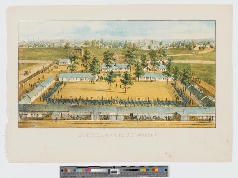 - Image of the La Fayette barracks in Baltimore, Maryland, during the American Civil War; buildings around a square courtyard with ranks of soldiers assembled at attention in the center of the yard; men working in outer areas; city of Baltimore visible in background.
