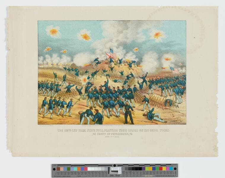 - Image of the Union soldiers of the 109th New York Infantry Regiment storming a hill in siege of Confederate troops at Petersburg, Virginia, during the American Civil War; men shoot from behind barricades, charge forward with swords raised, or help carry and tend to the wounded and the dead; smoke and explosions from artillery in the air.