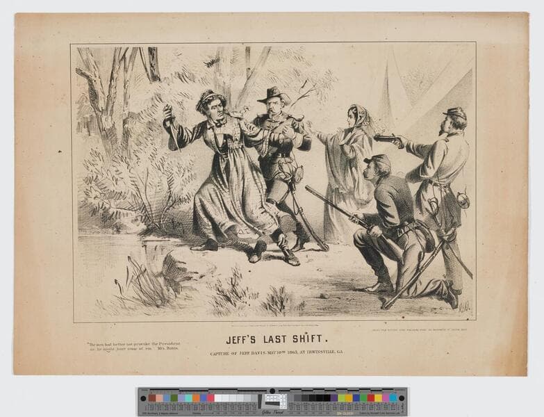 - Image of Confederate President Jefferson Davis, dressed in a bonnet and dress and wielding a Bowie knife, being captured by Union soldiers during the American Civil War; two Union soldiers point their guns at Davis while a third grabs Davis's arm; a woman (possibly his wife Varina Davis) raises her hands in alarm.