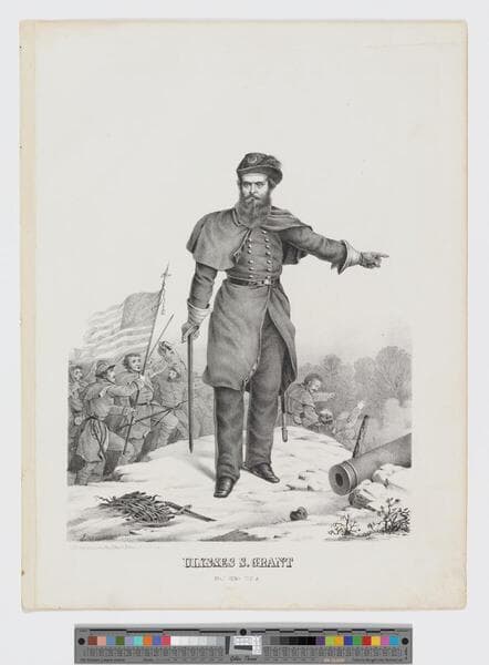 - Image of a full-length portrait of American Civil War Union Major General Ulysses S. Grant in full military uniform with sword in hand and arm outstretched (likely an incorrect likeness of General Grant); artillery and soldiers marching with American flag raised visible in background.
