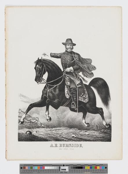 - Image of a full-length portrait of American Civil War Union Major General Ambrose Burnside on horseback in full military uniform with reins in hand and arm outstretched.