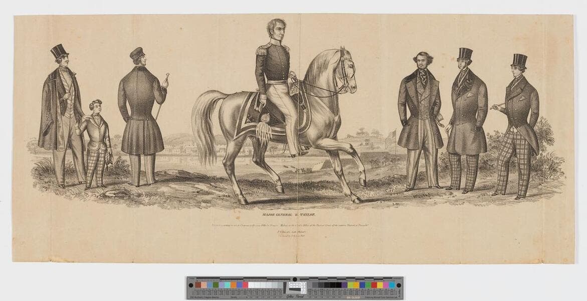 - Image of United States Major General Zachary Taylor on horseback in military uniform; men and a boy on either side stand wearing contemporary men's clothing styles in the manner of a fashion plate, including patterned pants, jackets with nipped-in waists, vests, neck ties, and top hats; river landscape with town visible in background.