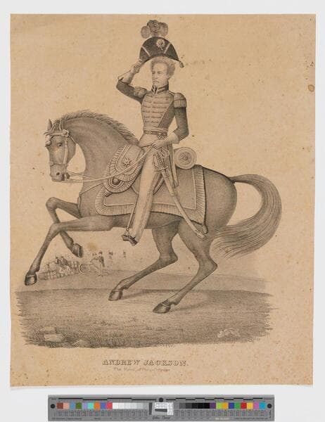 - Image of a portrait on United States General Andrew Jackson on horseback raising his hat in his hand in full military uniform; soldiers fighting on the line with guns and artillery in the Battle of New Orleans in January of 1815 in the background.