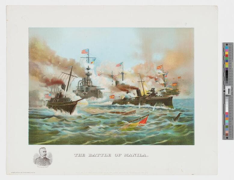 - Image of the Battle of Manila Bay in the Philippines in 1898; American ships led by Rear Admiral George Dewey are shown firing on Spanish war ships; explosions and smoke partially obscure the view; bust-length portrait of Dewey in military uniform at bottom left.