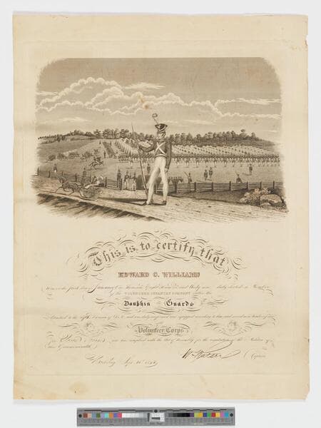 - Image of a certificate with image of a soldier in full military uniform standing with rifle and bayonet in hand on a dirt road outside the fence of a large military encampment; ranks of soldiers on foot and on horseback, cannons, and rows of tents visible in camp; civilian man and woman in a two-wheeled horse-drawn cart in the foreground at left.