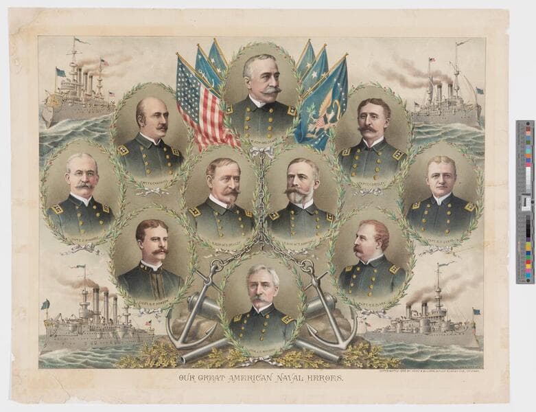 - Image of ten bust-length portraits with captions of American naval officers including Rear Admiral George Dewey, Captain French Ensor Chadwick, Captain Charles Vernon Gridley, Captain Charles Dwight Sigsbee, Rear Admiral Winfield Scott Schley, Rear Admiral William T. Sampson, Captain Robley Dunglison Evans, Lieut. Richmond P. Hobson, Captain Charles Edgar Clark, and Commodore John Crittenden Watson; battle ships U.S.S. New York, U.S.S. Olympia, U.S.S. Brooklyn, and U.S.S. Oregon pictured in corners, anchors, cannons, and American and military flags in background.